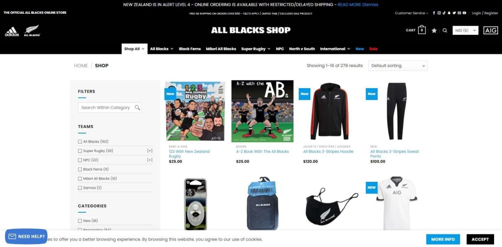 - All Blacks : la boutique en ligne officielle de l’équipe nationale de rugby de Nouvelle-Zélande, les All Blacks, est alimentée par WooCommerce.