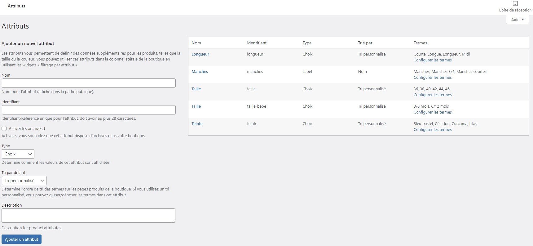 Vous disposez d’une gestion globale des attributs depuis le menu Produits > Attributs.