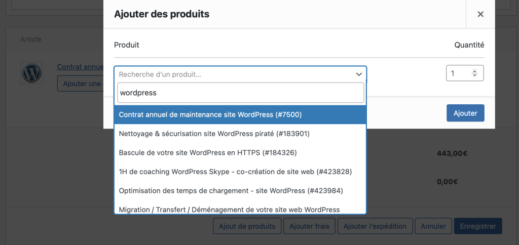 • Client : si le client est déjà enregistré sur votre site, commencez à taper son nom et sélectionnez-le dans la liste déroulante. Sinon, vous pouvez au préalable créer un nouveau client depuis le menu Comptes > Ajouter un compte de votre tableau de bord WordPress (en choisissant le rôle Client).