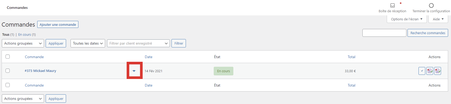 Si vous avez activé l’option d’écran « Actions », vous avez la possibilité de rapidement faire basculer une commande de l’état « En cours » à « Terminé ».
