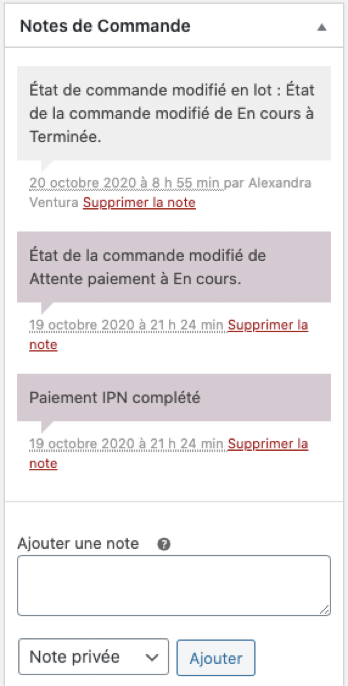 La trace de toutes les activités associées à la commande (ex. logs de paiement PayPal, …).