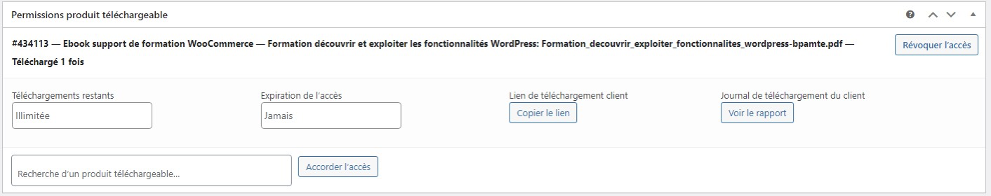 Section « Permissions produit téléchargeable »