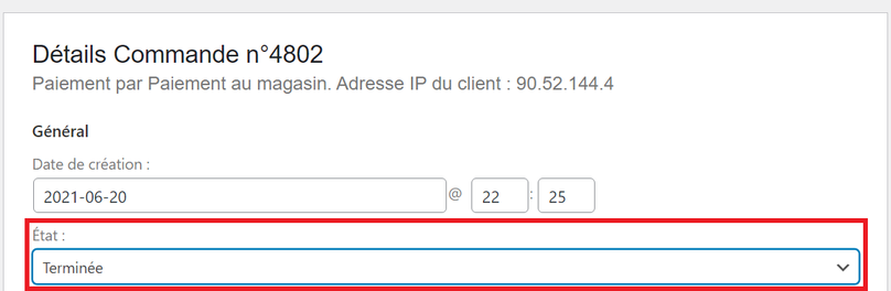La section « Général » vous indique les informations client : adresses (facturation et expédition) et vous donne la possibilité de modifier l’état de la commande.