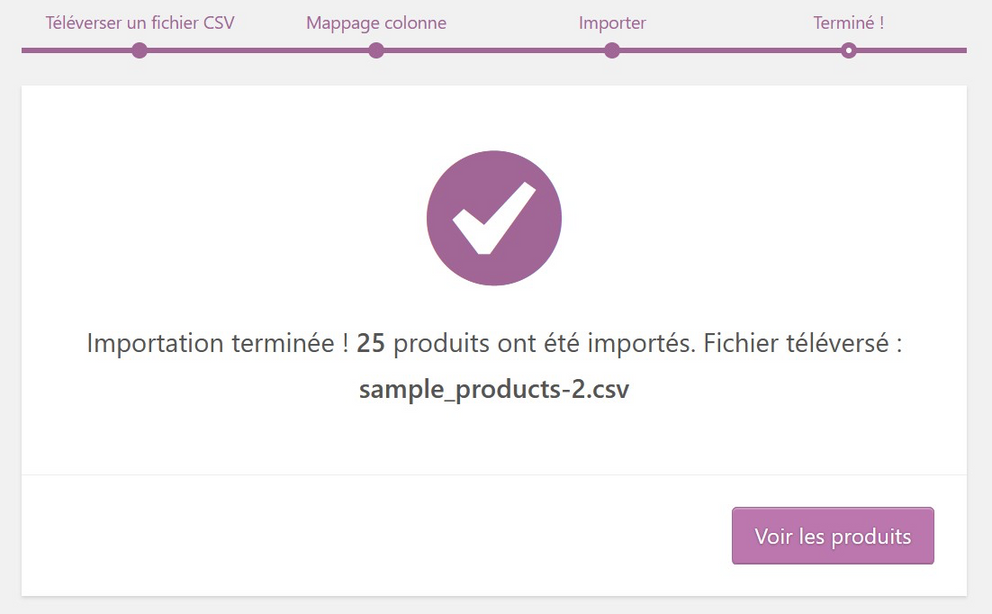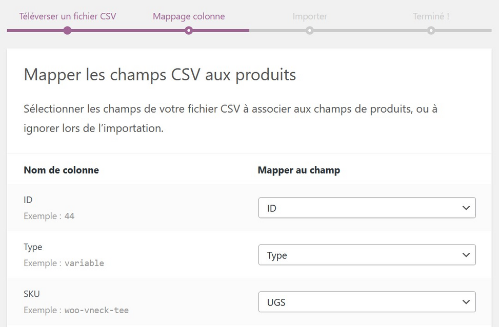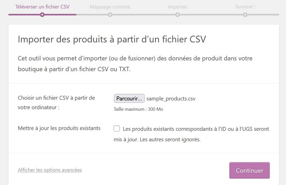Depuis WooCommerce, lancez l’import via le menu Produits > Importer présent dans le Tableau de bord WordPress.