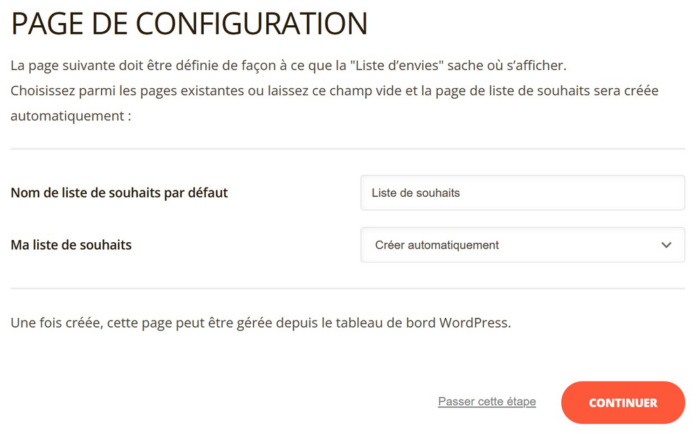 Elle dispose d’un assistant de configuration, qui vous permet de créer automatique la page dédiée à la gestion de sa liste de souhaits.